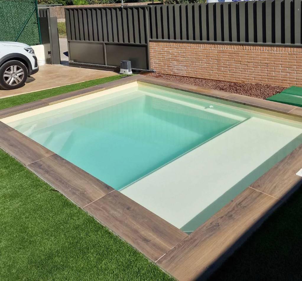 Una piscina cuadrada de dimensiones reducidas, ideal para ti si tienes poco espacio o quieres un lugar donde refrescarte de forma sostenible.