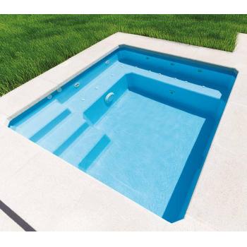 Con líneas elegantes y minimalistas. Se trata de un diseño versátil, útil tanto para espacios reducidos como para grandes espacios, en los que se puede instalar como un SPA asociado a una piscina más grande. Consta de un fácil acceso con tres peldaños y un banco corrido frente a la cascada. Cuenta con una elegante cascada que recoge el agua, sin skimmer, lo que permite que el nivel de agua suba prácticamente hasta el borde la piscina con un efecto casi infinity.